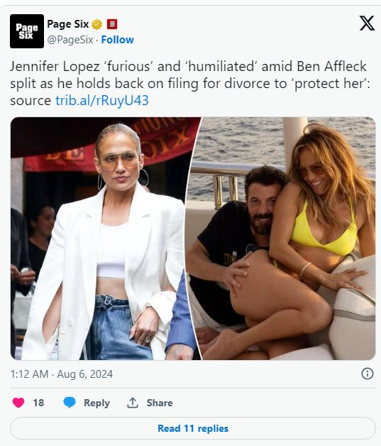 Jennifer Lopez ndihet e poshtëruar dhe e tradhtuar, pas ndarjes nga Ben Affleck, sipas një burimi të afërt për të. Burim që foli për Page Six thotë se ylli latin ndihet e poshtëruar nga sjellja e të dashurit të saj, pasi ai ishte i pari që bëri lëvizjen për t’u ribashkuar dhe tani po prish martesën e tyre.