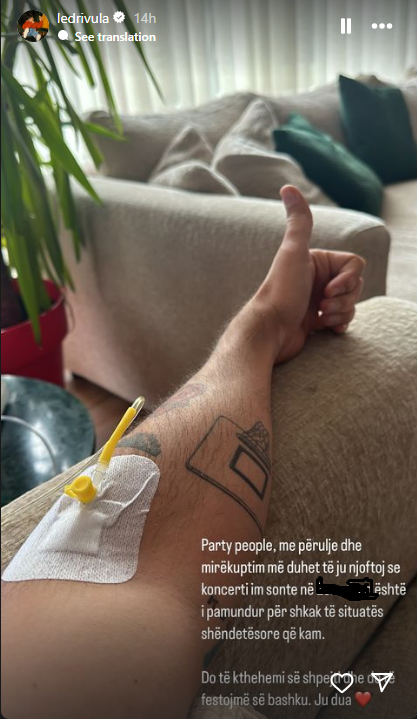“Party people. Me përulje dhe mirëkuptim, më duhet të ju njoftoj se koncerti im sonte është i pamundur për shkak të situatës shëndetësore që kam. Do të kthehem së shpejti dhe do të festojmë së bashku”, shkruan Ledri krah fotografisë.