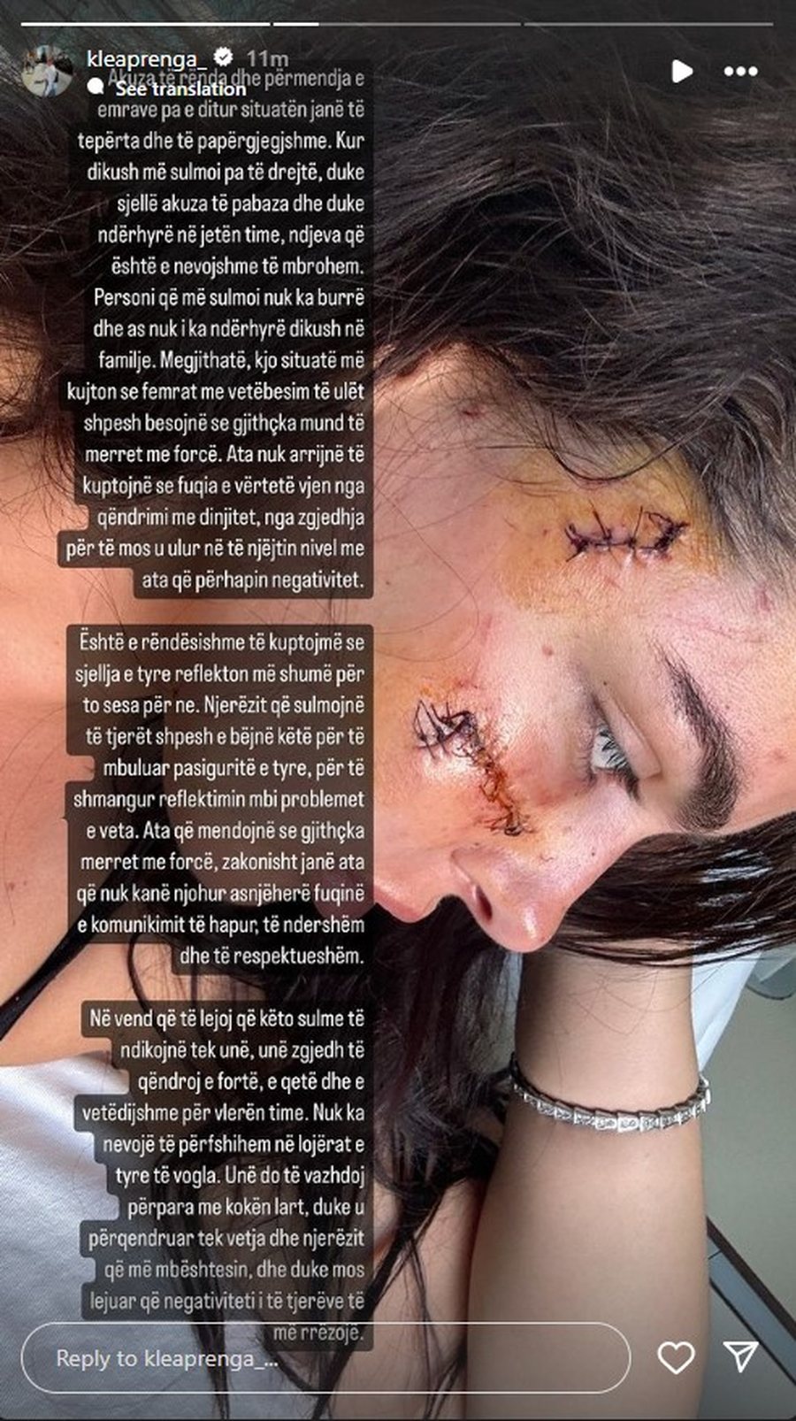 Në një reagim në Instagram, 24-vjeçarja shprehet se është goditur padrejtësisht, ndërsa shton se personi që e ka dhunuar nuk ka bashkëshort dhe as i ka ndërhyrë në familje. Ajo quan motrën e Antonela Berishës, ish-konkurrentes së Big Brother VIP 1 si femër me vetëbesim të ulët e cila beson se mund të fitojë gjithçka me forcë.