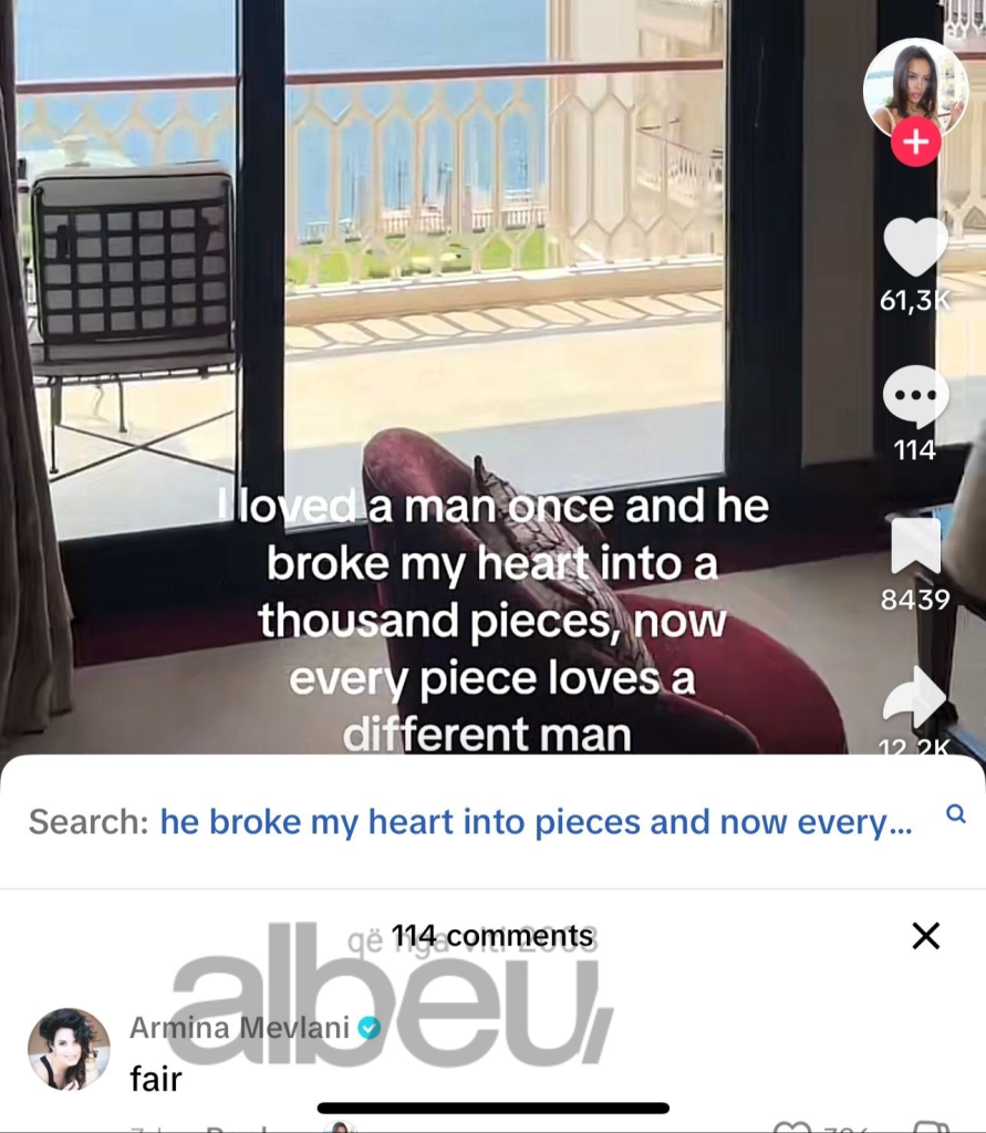 “Dikur dashurova një burrë dhe ai më theu zemrën në qindra pjesë. Tani çdo pjesë dashuron një burrë të ndryshë”, është ky shkrimi për të cilin Armina ka rënë dakord duke komentuar: “E drejtë”.