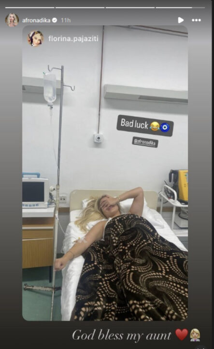 Në një postim në “Instastory”, ajo ka publikuar një fotografi ku shihet e shtrirë në spital, teksa merr infuzion.