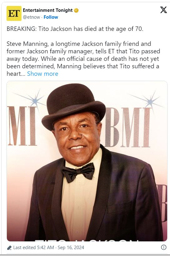 Tito Jackson , një anëtar i grupit “Pop Jackson 5” dhe vëllai i të ndjerit Michael Jackson , ka vdekur në moshën 70-vjeçare, raportojnë mediat amerikane.