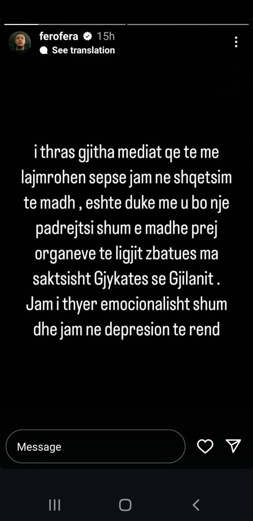Më pas shtoi: “Po bëj një thirrje për Prokurorinë e Gjilanit, veçanërisht për prokuroren që e ka rastin tim. Nuk po di si ta shpjegoj ndryshe që jam në një gjendje shumë të rëndë. Çka ndodh nëse unë nesër nuk mund t’i kontrolloj emocionet e mia?”
