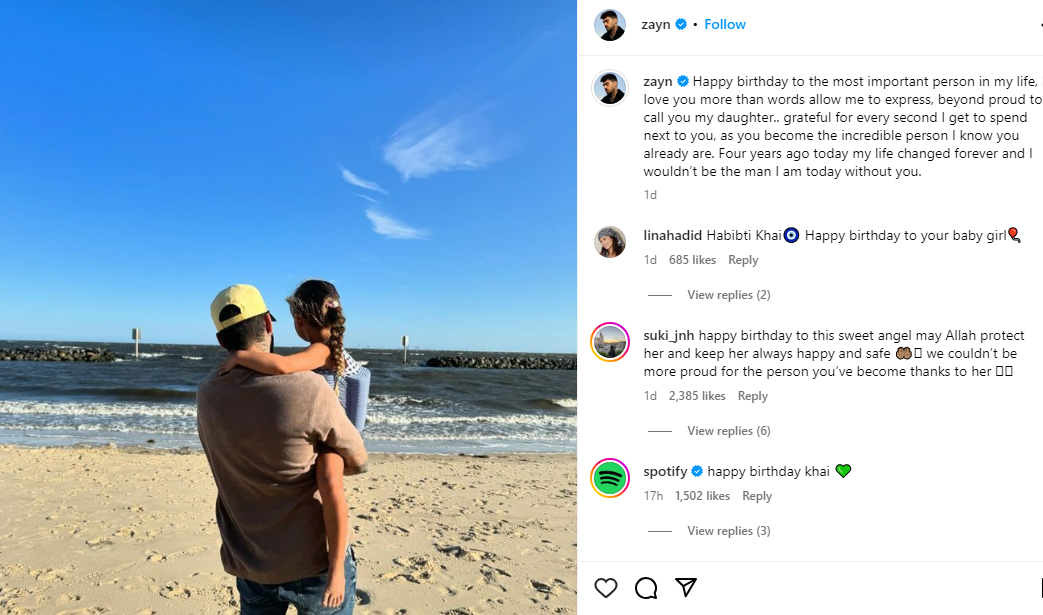 “Vajza jonë sot është 4 vjeç dhe ne festuam gjithë javën”. Hadid shtoi se vajza e saj dhe e Zayn është “kurioze, aventuriere, e dashur dhe oh, kaq e zgjuar. Khai është gëzimi dhe krenaria më e madhe e jetës sime!”