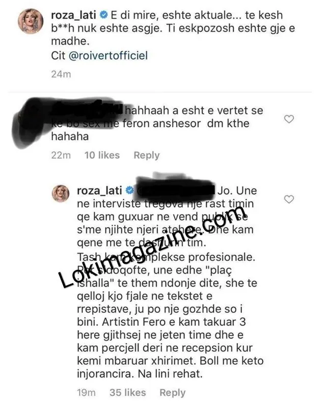 Roza nuk vonoi të jepte përgjigjen e saj, duke mohuar qartë këtë aludim. Ajo sqaroi se deklarata e saj për marrëdhënie në një ashensor kishte të bënte me të dashurin e saj dhe jo me reperin Fero. Sipas saj, ajo dhe Fero janë takuar vetëm tre herë dhe nuk kanë pasur asnjë lidhje intime.