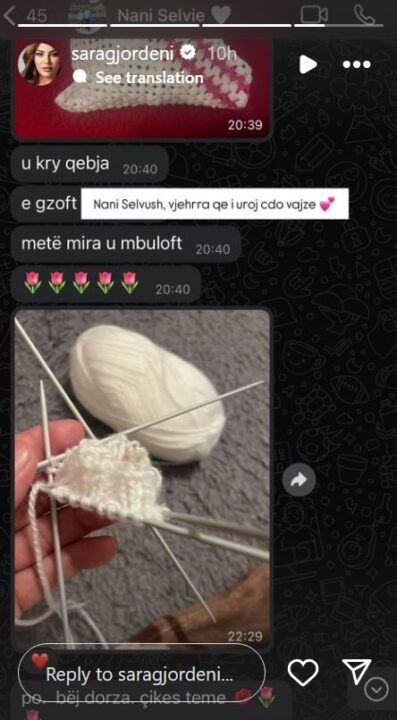 Në bisedën e publikuar duket se nëna e ish-banorit të shtëpisë më të famshme në Shqipëri po thur një palë doreza për bebushen e çiftit, e cila pritet të vi në jetë së shpejti.