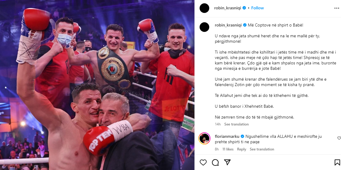 Boksieri i njohur shqiptar, Robin Krasniqi, ka dhënë një lajm të trishtë për ndjekësit në rrjete sociale. Ai ka njoftuar se babai i tij është ndarë nga jeta.