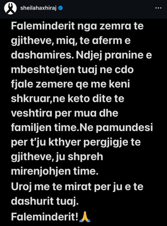 “Faleminderit nga zemra të gjithëve, miq, të afërm e dashamirës. Ndjej praninë e mbështetjen tuaj në çdo fjalë zemre që më keni shkruar në këto ditë të vështira për mua dhe familjen time. Në pamundësi për t’ju kthyer përgjigje të gjithëve, ju shpreh mirënjohjen time. Uroj më të mirat për ju e të dashurit tuaj. Faleminderit”, shkruhet në postim.