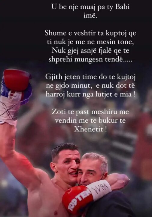 Boksieri i njohur Robin Krasniqi ka ndarë një mesazh prekës për të atin e ndjerë, i cili u nda nga jeta një muaj më parë. Në postimin e tij emocional, Krasniqi tregon se dhimbja për humbjen e të atit mbetet ende e pashëruar.