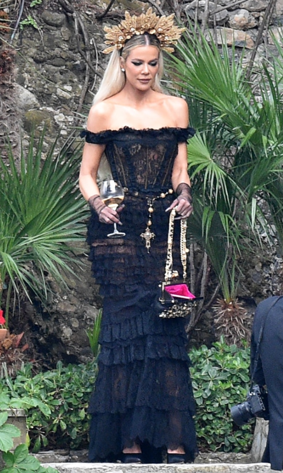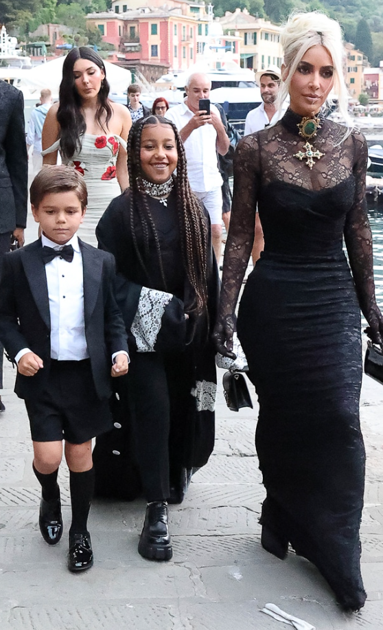 Nusja, dhëndri dhe familjet e tyre ishin veshur të gjitha me Dolce & Gabbana. Kourtney kishte veshur një fustan të shkurtër në stilin e korsesë, me një vello të madhe, të qëndisur. Travis kishte veshur një kostum të zi.