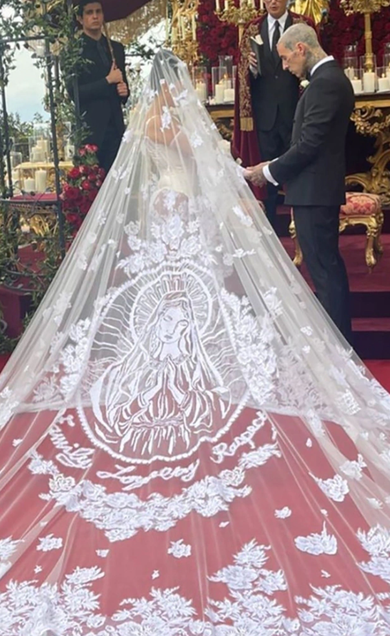 Velloja e Kourtney ishte me Virgjëreshën Mari dhe fjalët “Family Loyalty Respect” që përputhen me tatuazhin që Travis ka në kokë.