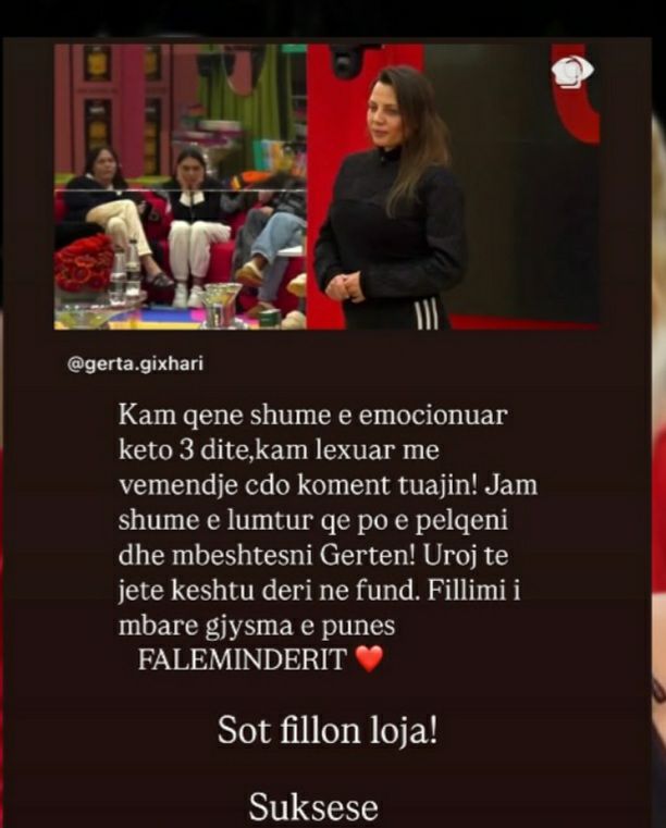 Jashtë shtëpisë është komentuar jo vetëm qëndrimi i saj në shtëpi por dhe fakti që nuk mori asnjë mesazh mbështetës prej së motrës, Olta Gixharit, në nisje të këtij edicioni.