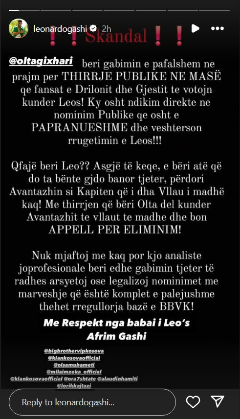 @oltagixhari beri gabimin e pafalshem ne prajm per THIRRJE PUBLIKE NE MASË qe fansat e Drilonit dhe Gjestit te votojn kunder Leos! Ky osht ndikim direkte ne nominim Publike qe osht e PAPRANUESHME dhe veshterson rrugetimin e Leos!!! Qfajë beri Leo?? Asgjë të keqe, e bëri atë që do ta bënte gjdo banor tjeter, përdori Avantazhin si Kapiten që i dha Vllau i madhë kaq! Me thirrjen që bëri Olta del kunder Avantazhit te vllaut te madhe dhe bon APPELL PER ELIMINIM! Nuk mjaftoj me kaq por kjo analiste joprofesionale beri edhe gabimin tjeter të radhes arsyetoj ose legalizoj nominimet me marveshje që është komplet e palejushme thehet rregullorja bazë e BBVK! Me Respekt nga babai i Leo’s Afrim Gashi