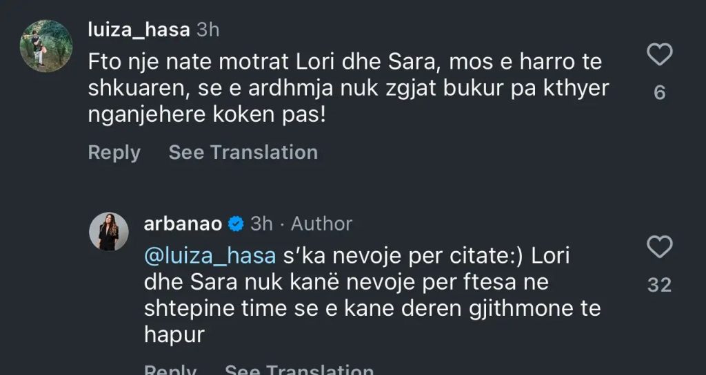 Moderatorja e njohur Arbana Osmani i është përgjigjur një komentuesi në Instagram që i sugjeroi të ftojë Lori dhe Sara Hoxhën në emision. Komentuesi shkruan: “Fto një natë motrat Lori dhe Sara, mos e harro të shkuarën, se e ardhmja nuk zgjat bukur pa kthyer nganjëherë kokën pas.”