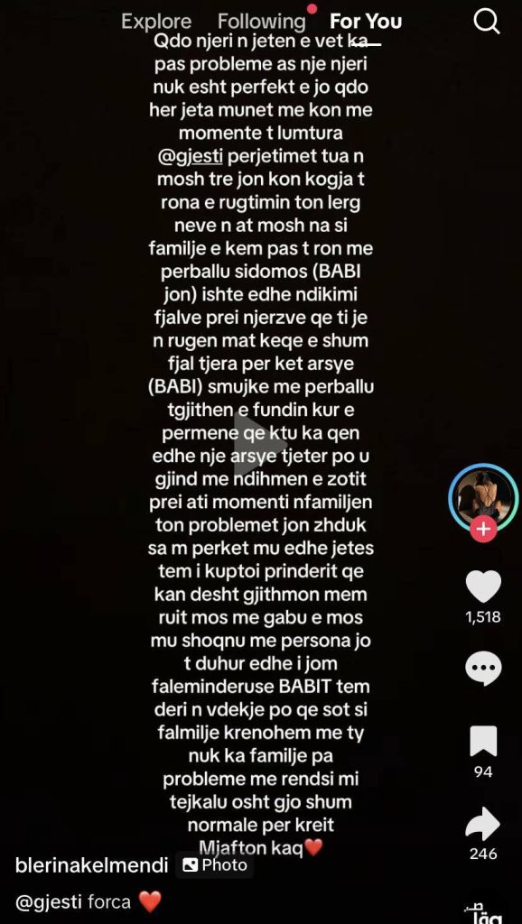 Blerina Kelmendi, në ‘Tik-tok’ ka shkruar “Çdo njeri në jetën e vet ka pas probleme as një njeri nuk është perfekt, babi fjalët e tjerëve nuk mujke me i përballu ashtu ishte edhe reagimi i tij, ne jemi krenar me ty”.