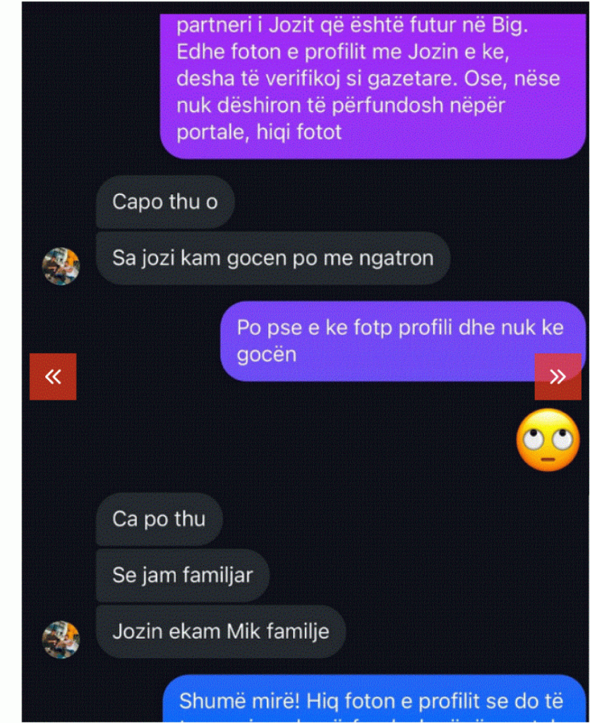 Të shumtë ishin ata që shprehën mosbesim nga ajo që Desara tha, ndaj gazetarja publikoi foto të Jozit me personin në fjalë, si edhe mesazhe që ka shkëmbyer me të. Ky i fundit në komunikime, insiston se është i martuar me fëmijë madje i kërkon t’i heqë fotot që gazetarja ka nxjerrë duke thënë se Jozin e ka mik familjar.