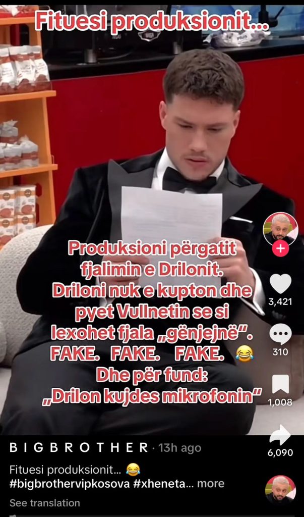 Një video që ka qarkulluar në TikTok ka nxjerrë në pah një moment të pazakontë gjatë leximin e letrës nga Driloni, fituesi i BBVK 3. Ai kishte hasur në një vështirësi të papritur me një fjalë në tekst – “gënjejnë” – dhe kishte kërkuar ndihmë nga Vullneti për shqiptimin e saj. Ky incident ka nxitur spekulime të shumta në rrjetet sociale, pasi letra ishte prezantuar si një krijim personal i Drilonit.