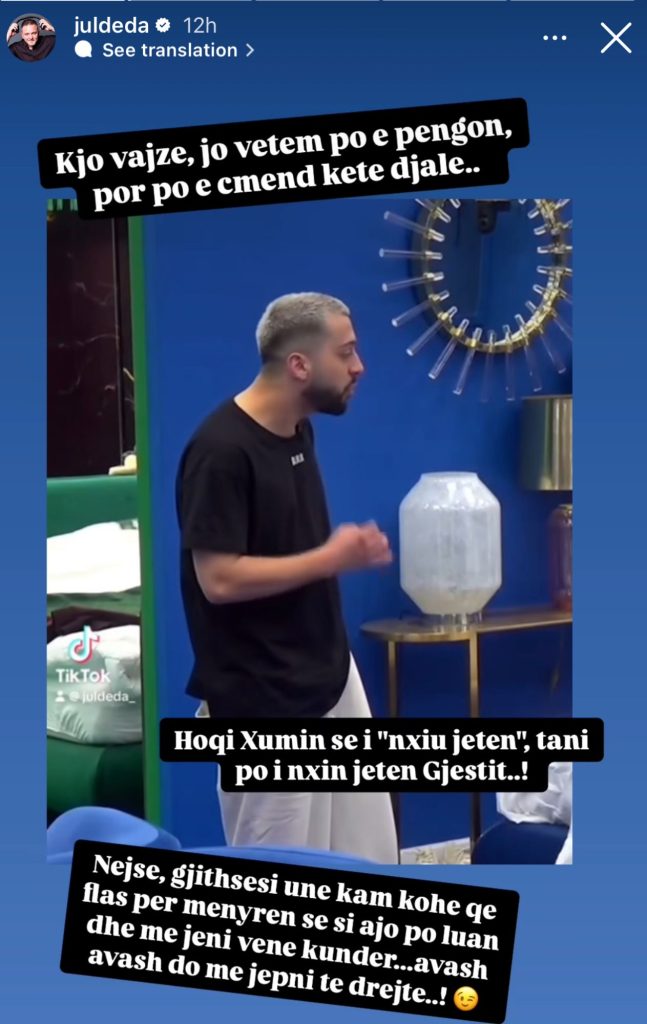 Aktori dhe ish-finalisti i BBVA3 nuk ka shpëtuar nga ‘tundimi’ për ta komentuar sjelljen e Eglit ku në një Instastory ka shkruar: