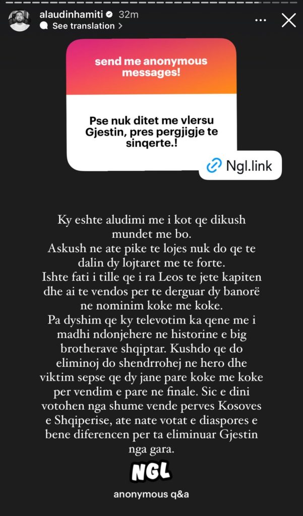 Prezantuesi i ‘Big Brother VIP Kosova’, Alaudin Hamiti ka vendosur t’i përgjigjet pyetjeve të publikut. Në një prej tyre ai u pyet edhe për nominimin mes Gjestit dhe Drilonit duke thënë se Gjesti u eliminia pasi votat e diasporës bënë diferencën.