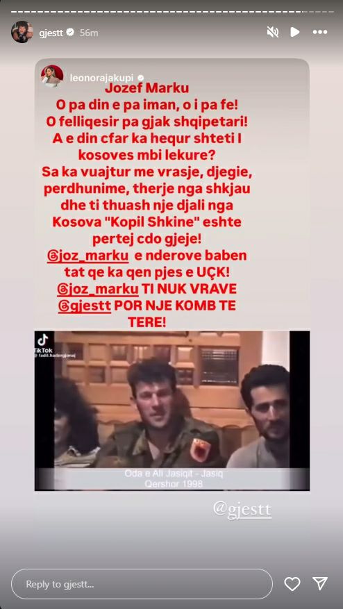 “Jozef Marku, O pa din e pa iman, o i pa fe! Fëlliqësirë pa gjak shqiptari! A e din çfarë ka hequr shteti i Kosovës mbi lëkurë? Saka vuajtur me vrasje, djegie, përdhunime, therje nga shkjau dhe ti thuash një djali nga Kosova ‘k*pil shkine’ është përtej çdo gjëje! Joz Marku e nderove babën tat që ka qenë pjesë e UÇK! Joz Marku ti nuk vrave Gjestin, por një komb të tërë”, shkroi këngëtarja.