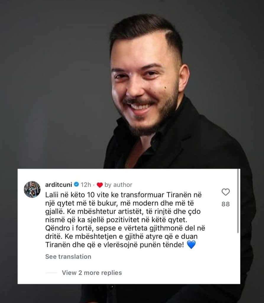 Këngëtari Ardit Çuni vlerësoi (sipas tij) transformimin e Tiranës gjatë drejtimit të Veliajt, duke theksuar mbështetjen e tij për artistët dhe të rinjtë. Ai shprehu besimin se e vërteta do të dalë në dritë dhe se Veliaj ka mbështetjen e atyre që e duan dhe e vlerësojnë punën e tij.
