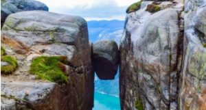 Në Norvegjinë Jugore, pranë fshatit Lisebotn, midis dy shkëmbinjve, ose thënë më mirë në një hendek të malit Kjerag, në një lartësi prej gati 1.000 metrash, është vendosur guri Kjeragbolten.