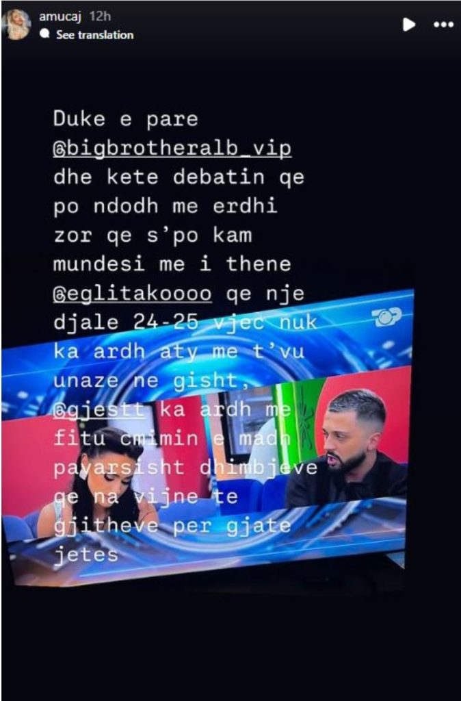 Duke pare ‘BBVA’ me erdhi zor që s’po kam mundësi me i thënë Egli Tako’s që një djalë 24-25 vjeç nuk ka ardh aty me t’vu unaze në gisht, Gjesti ka ardh me fitu çmimin e madh pavarësisht dinamikave që na vijnë të gjithëve për gjatë jetës” Ishin fjalët e saj.