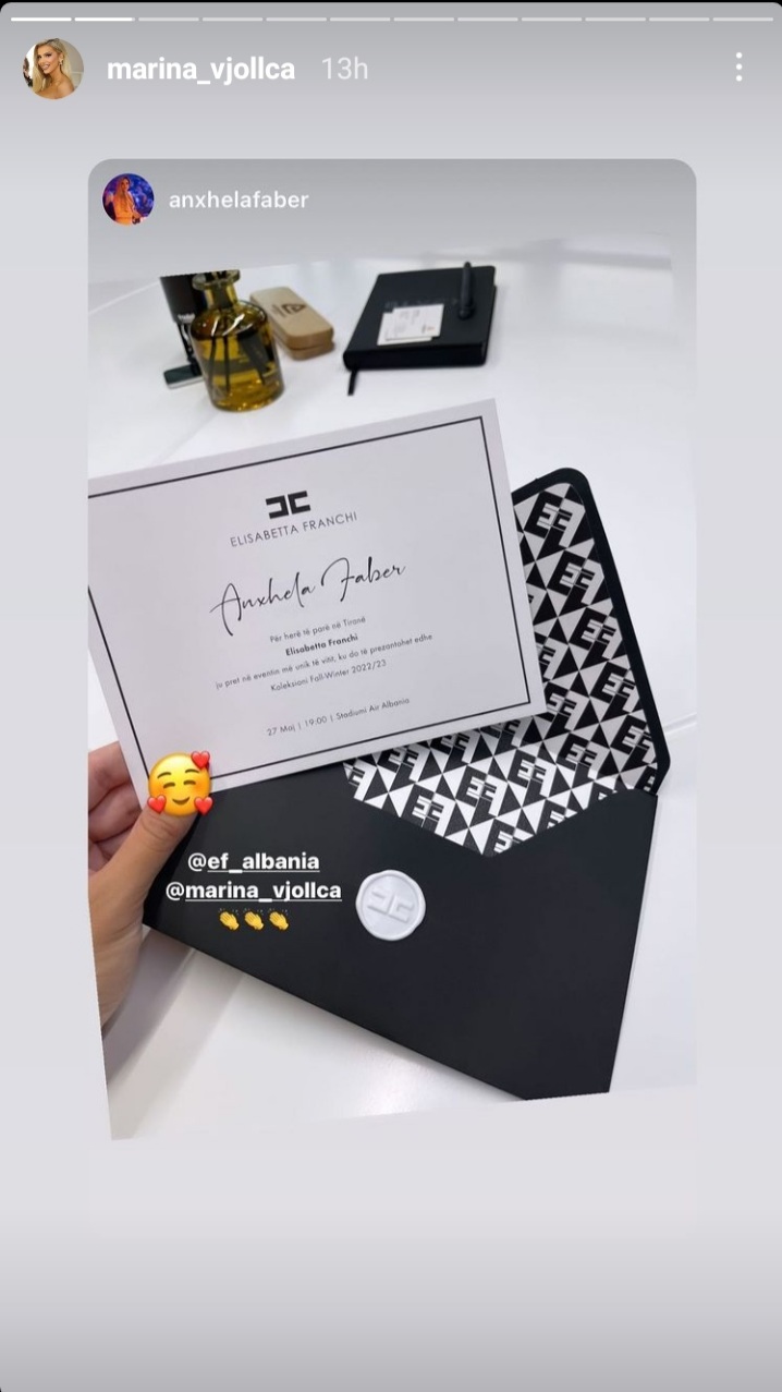 Marina Vjollca është një nga bashkëpuntoret e stilistes në fjalë,gjithmon e kemi parë duke promovuar veshje dhe stilet më të fundit të brendit të Elisabetta Franchi. Ishte pikërisht Marina Vjollca që lëshoi lajmin për sfilatën e rradhës.