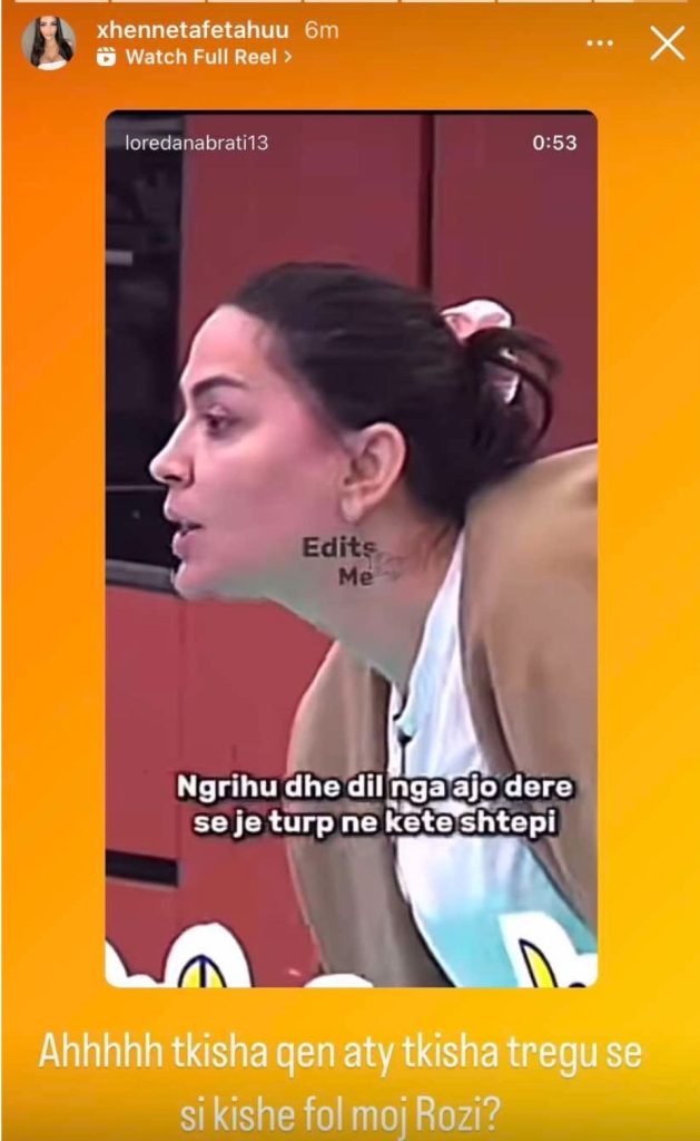 Xheneta Fetahu nuk po heq dorë nga ‘Big Brother’, njëherësh banore tashme po e bën edhe rolin e komentueses në llogarinë e saj.Pak me parë ka publikuar një video teksa shihet Rozana Radi në debat me Loredanën, dhe fjalët e Xhenetës ishin “Ahh kisha qenë aty t’kisha tregu se si kishe fol moj Rozi”.