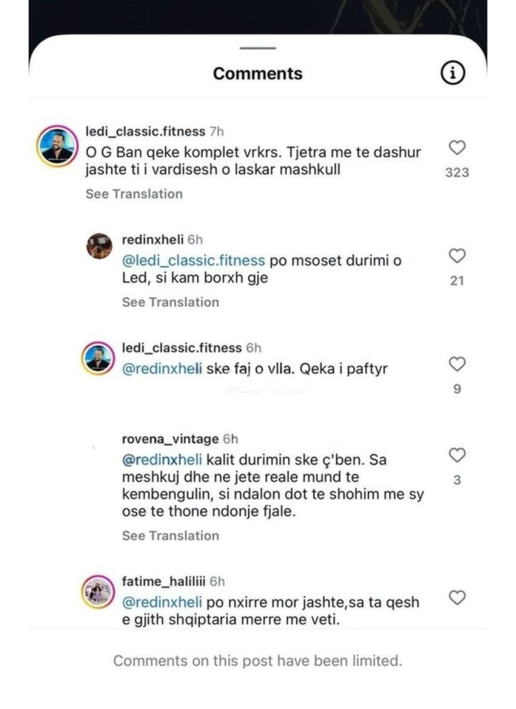 Në komentet e një videoje në faqen e “Big Brother VIP Albania” në ‘instagram’ Redin Xheli, partneri i Danjës, i ka kthyer komentin një tjetër personi i cili ofendonte G Banin për sjelljen e tij kundrejt Danjës.