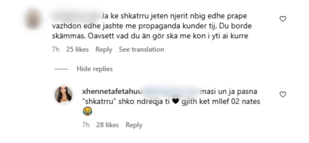 “Ja ke shkatërru jetën njeriut në Big, edhe prap vazhdon edhe jashtë me propagandu kundër tij… Ai s’ka me ‘kon’ kurrë i yti”, ishte komenti që ajo mori nga një përdorues, duke e pasur fjalën për Gjestin.