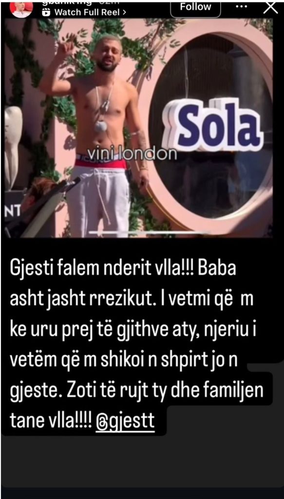 Mbrëmjen e së martës që lamë pas, G Bani i dha fund përfundimisht aventurës së tij në BBA. Pas vizitës së Ledionit të shtëpi, ku i dha lajmin se i ati ishte në gjendje të rëndë, G Bani u largua menjëherë nga gara. Pas largimit, këngëtari përmes një statusi në “Instagram” theksoi se nuk ishte gënjeshtër, por nuk do të postonte asgjë me të atin e sëmurë. Sot, më shumë se 20 orë më vonë, ai ka reaguar sërish, duke falënderuar Gjestin dhe duke e konsideruar ai të vetmin që e uroi nga banorët aty. Babai i G Banit është jashtë rrezikut për jetën.