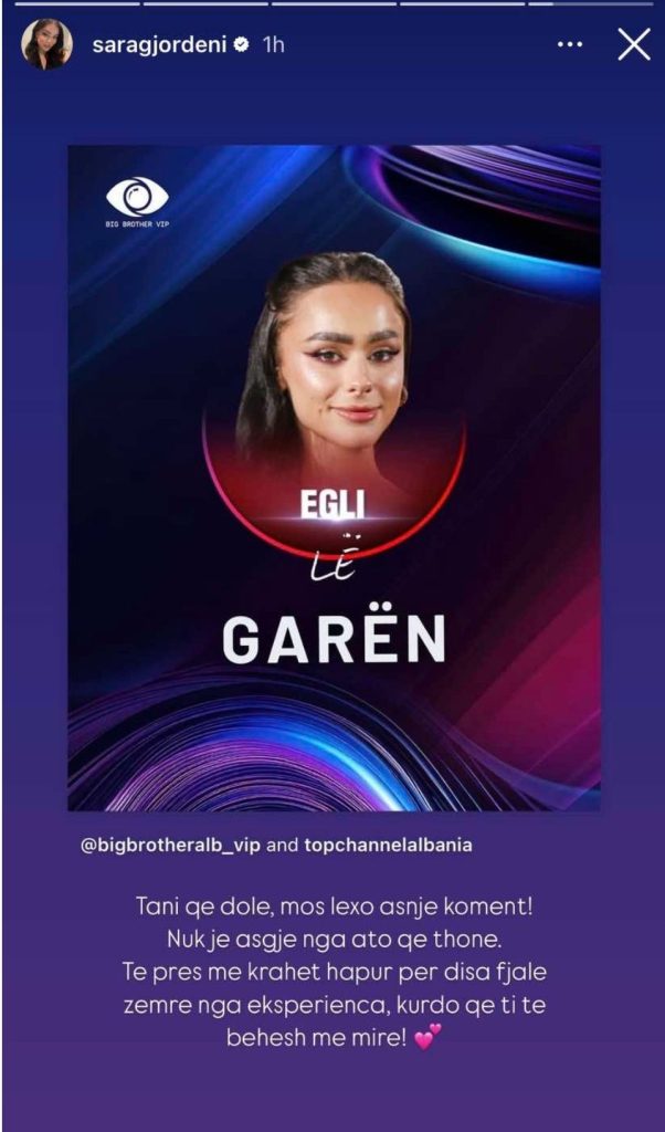 Egli Tako sonte është larguar përfundimisht nga gara për çmimin e madh në ‘Big Brother VIP Albania’.E menjëherë pas daljes Sara Gjordeni ka bërë një postim duke treguar se e mirëpret në shtëpisë e saj por sa të bëhet më mire.