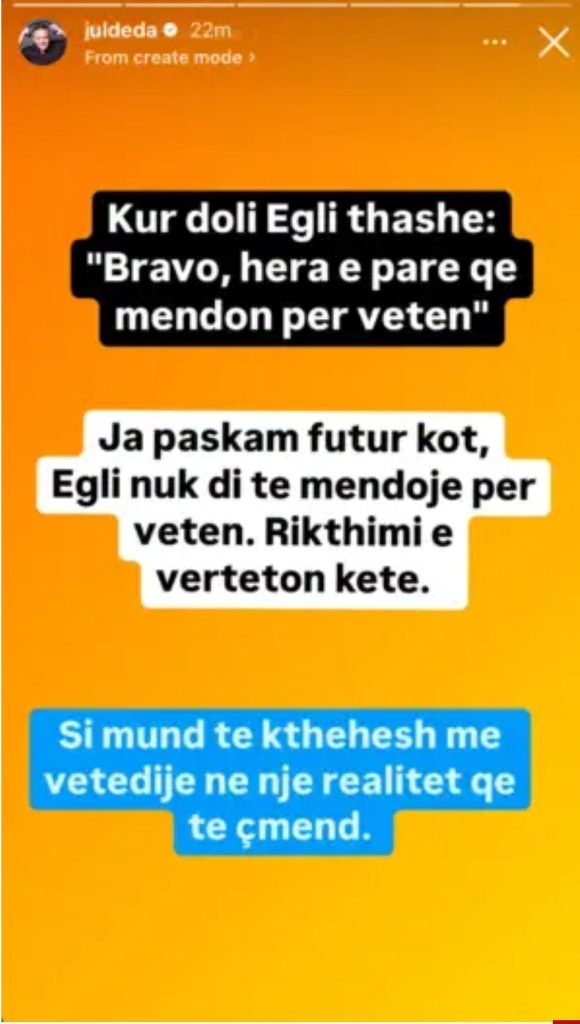 “Kur doli Egli thashë: ‘Bravo, hera e parë që mendon për veten.’ Ja paskan futur kot, Egli nuk di të mendojë për veten. Rikthimi e vërteton këtë. Si mund të kthehesh me vetëdije në një realitet që të çmend,” – shkruan Deda.