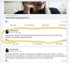 Andaj në rrjet po qarkullojnë komentet e saj ku ishte shprehur “Mbajeni këtë Nedën larg nga rrugët kryesore kur të dali se do ta shtyp me makinë, me acaroi”.