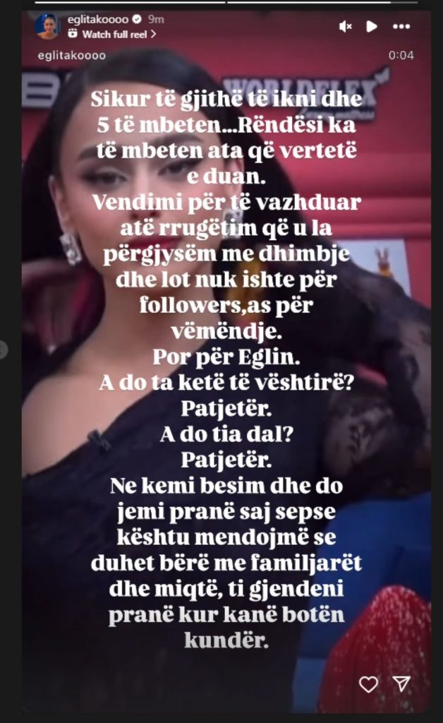 Përmes një postimi ajo ka theksuar se “Sikur të gjithë të ikin dhe 5 të mbetën, rëndësi ka të mbeten ata që të duan vërtet, ne kemi besim dhe jemi pranë saj sepse kështu mendojmë se duhet bërë me familjaret dhe miqtë, ti gjendemi pranë kur kanë botën kundër ”.