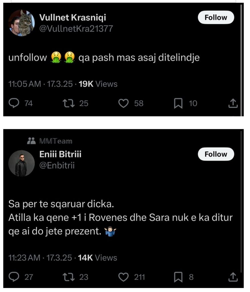 “Sa për të sqaruar diçka – Atilla ka qenë +1 i Rovenës, Sara nuk e ka ditur që ai do jetë prezent”, shkroi ai.