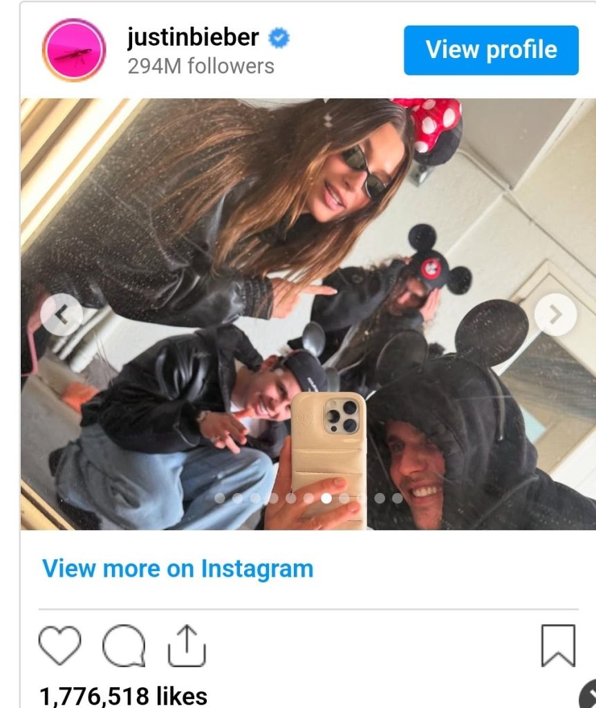 Midis fotove është një nga udhëtimi në Space Mountain. Në një tjetër foto, Bieber dhe Hailey ishin në një sallë lojërash dhe në njërën, këngëtari po i tregonte aparatit gishtin e mesit teksa pozonte pranë gruas së tij.