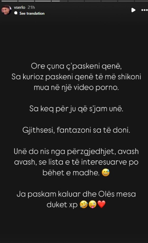 “Ore çuna ç’paskeni qenë. Sa kuriozë paskeni qenë të më shikoni mua në një video porno. Sa keq për ju që s’jam unë. Gjithsesi, fantazoni sa të doni. Unë do nis nga përzgjedhjet, avash-avash, se lista e të interesuarve është bërë shumë e madhe. Ja paskam kaluar edhe Olës mesa duket.”