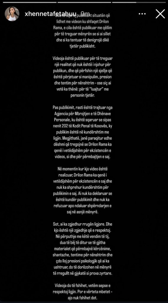 Një video e publikuar së fundmi, ku shfaqet Drilon Rama, ka shkaktuar reagime të forta në rrjetet sociale. Videoja, e cila është bërë publike nga Xheneta Fetahu, sipas saj ka pasur për qëllim të tregojë një realitet të panjohur për publikun, duke evidentuar sjellje të cilat i ka përjetuar si manipulim, presion dhe tentim për nënshtrim.