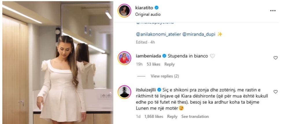 Në imazhet e fundit që ka publikuar moderatorja dhe komenti i këngëtarit ka marrë gjithë vëmendjen ku shprehet “Siç e shikoni pra zonja dhe zotërinj, me rastin e rikthimit të linjave që Kiara dëshironte (që për mua është kukull edhe po të futet në thes) besoj se ka ardhur koha ta bëjmë Lunën me një motër”.