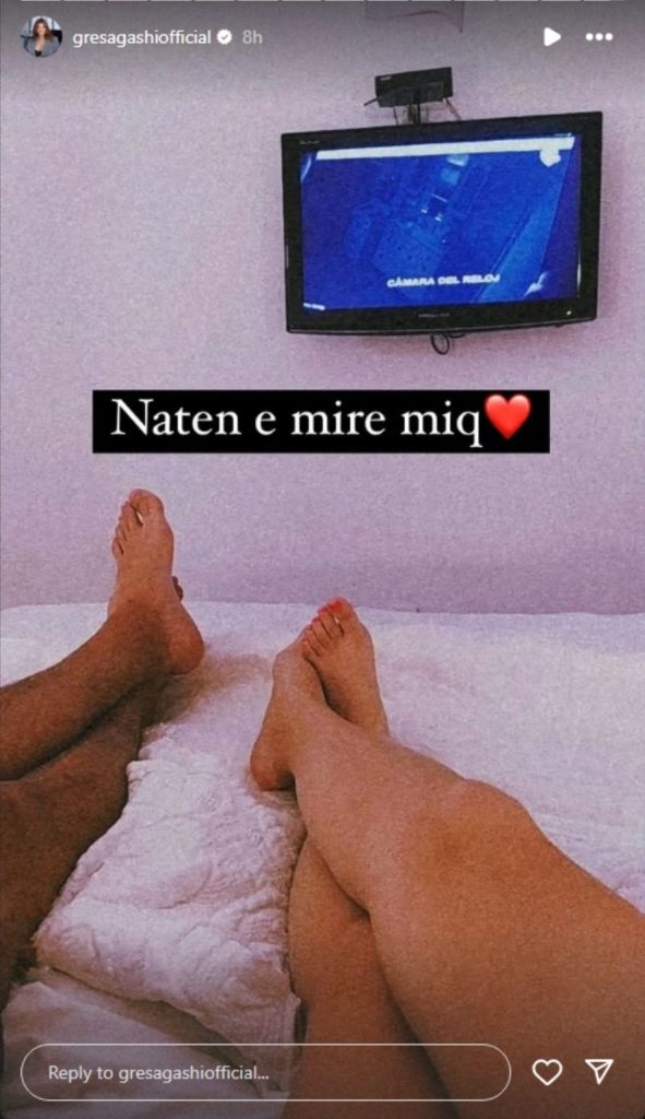 Në imazhin e publikuar, Gresa ka ndarë një moment me të dashurin e saj nga shtrati, ku shihen vetëm këmbët e tyre të mbuluara, duke lënë të nënkuptohet një moment intim e romantik mes çiftit.