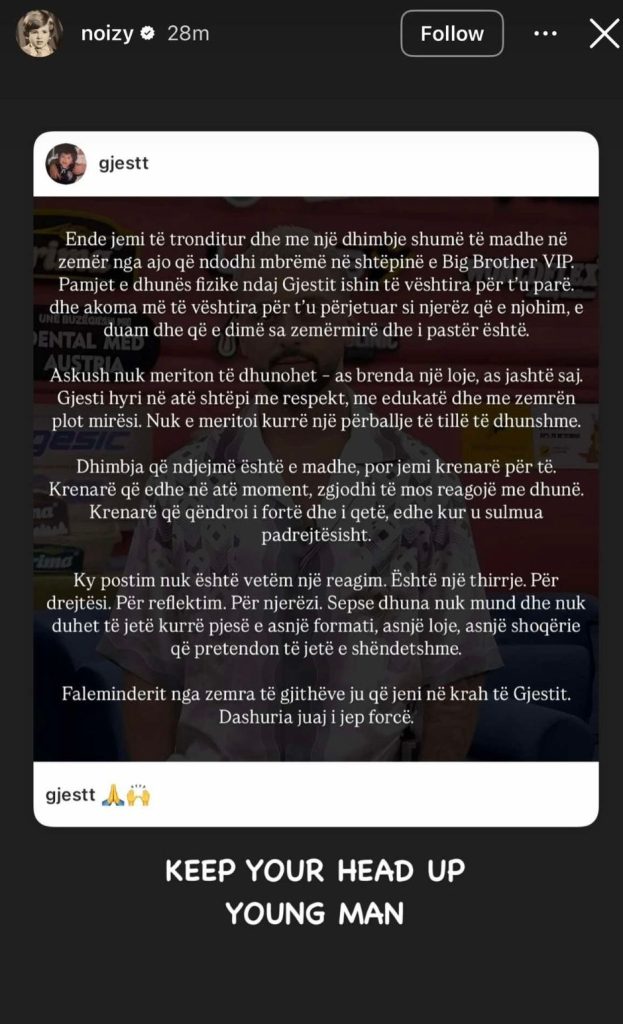 Noizy ka kërkuar nga Gjesti që ta mbajë kokën lart. Kështu thuhet në një ‘Insta Story’ të tij, ku ka shpërndarë reagimin e familjarëve të banorit nga Peja.