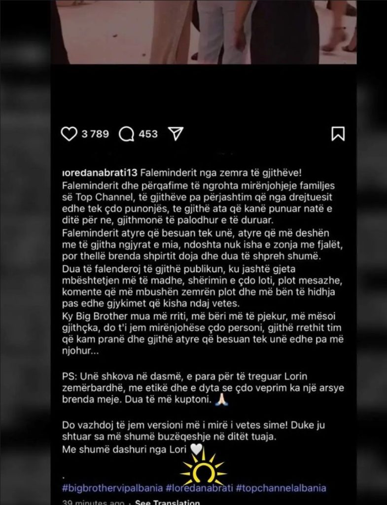 Në një postim të gjatë në Instagram, Lori shpreh mirënjohjen e saj për familjen e Top Channel dhe për çdo person që ka punuar pas kuintave, duke theksuar: