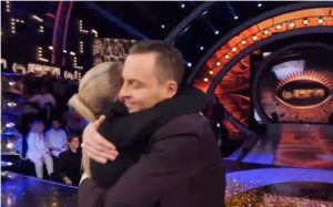 Pas përfundimit të spektaklit, në një moment të papritur dhe shumë të ndjerë, bashkëshortja e tij, Sara Hoxha, u ngjit në skenë dhe e përqafoi në sy të të gjithëve.