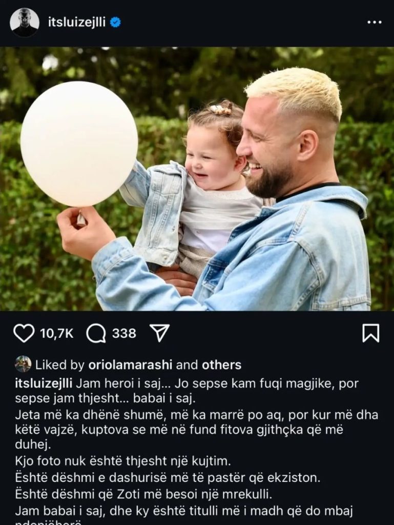 “Jam heroi i saj… Jo sepse kam fuqi magjike, por sepse jam thjesht… babai i saj”, shkruan Luizi, duke reflektuar mbi rolin e tij si prind. Ai shprehet se jeta i ka dhënë dhe marrë shumë, por lindja e vajzës ishte momenti ku ndjeu se kishte fituar gjithçka që i duhej.