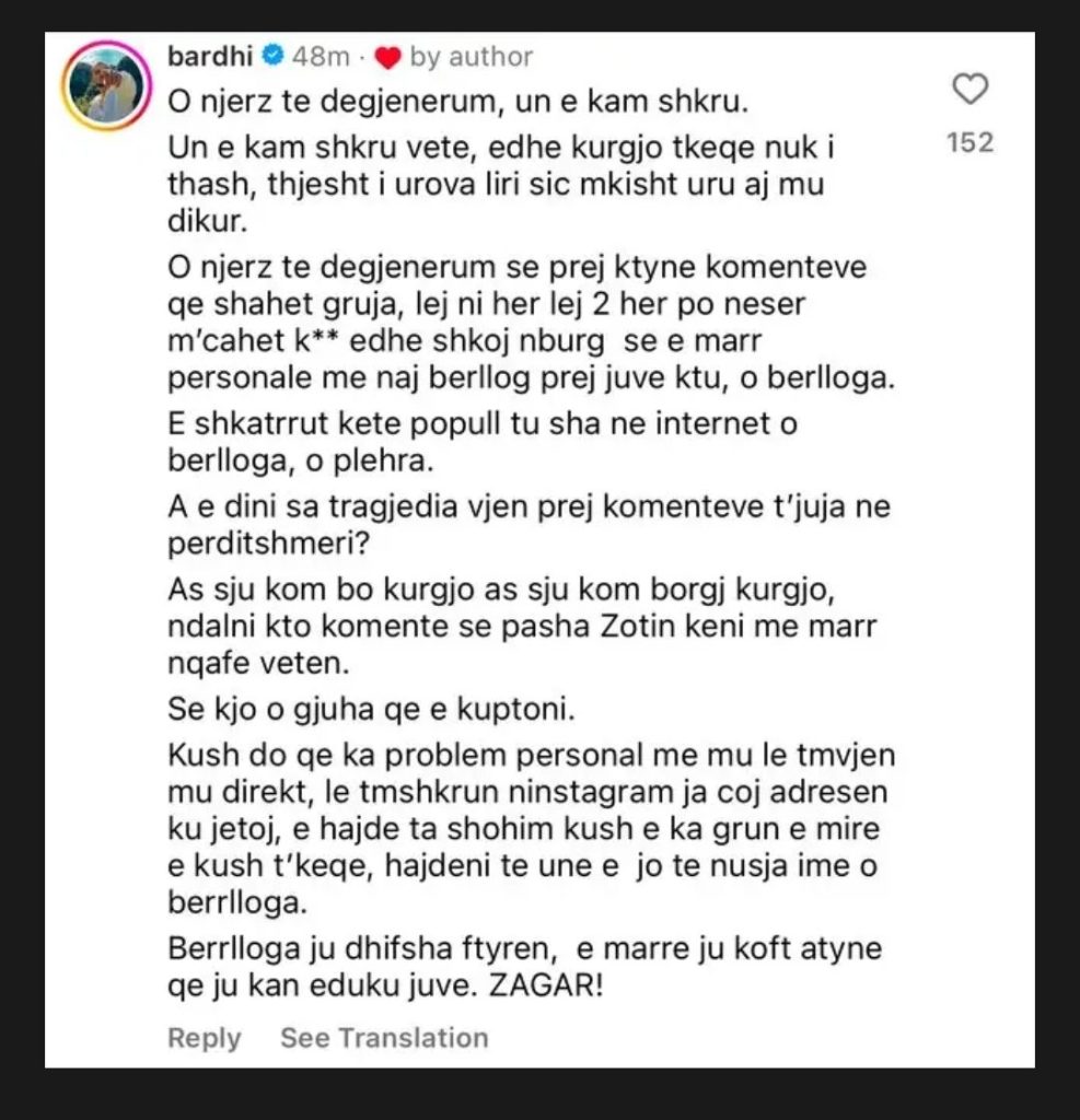 “Mos i përfshini gratë në dramën tuaj,”- shkruan ai me vendosmëri ne postimin e shpërndarë nga vetë ne, duke i cilësuar komentuesit negativë si “berlloga” dhe “plehra”.