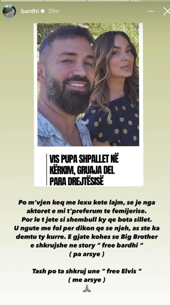 “Po më vjen keq me lexu këtë lajm se je nga aktorët e mi të preferum të fëmijërisë. Por le të jetë si shembull ky që bota sillet. U ngutë me fol për dikon që s’e njeh, as s’të ka dëmtu ty kurrë. E gjatë kohës së Big Brother e shkrujshe në story ‘Free Bardhi’ pa arsye, tash po ta shkruj unë ‘Free Elvis’ me arsye”, shkruan Bardhi në reagimin e tij.
