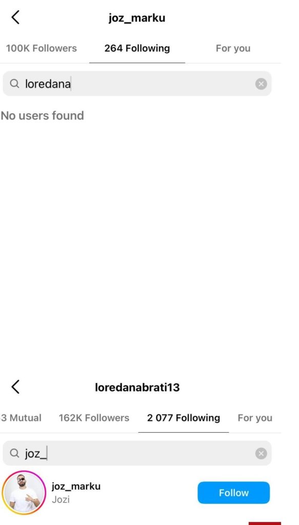 Së fundmi, Jozi ka hequr Loredanën nga lista e ndjekësve në Instagram, ndërsa ajo ende e ndjek atë. Ky veprim ka shkaktuar reagime të shumta në rrjet, duke bërë që ndjekësit të aludojnë për një ndarje mes tyre.