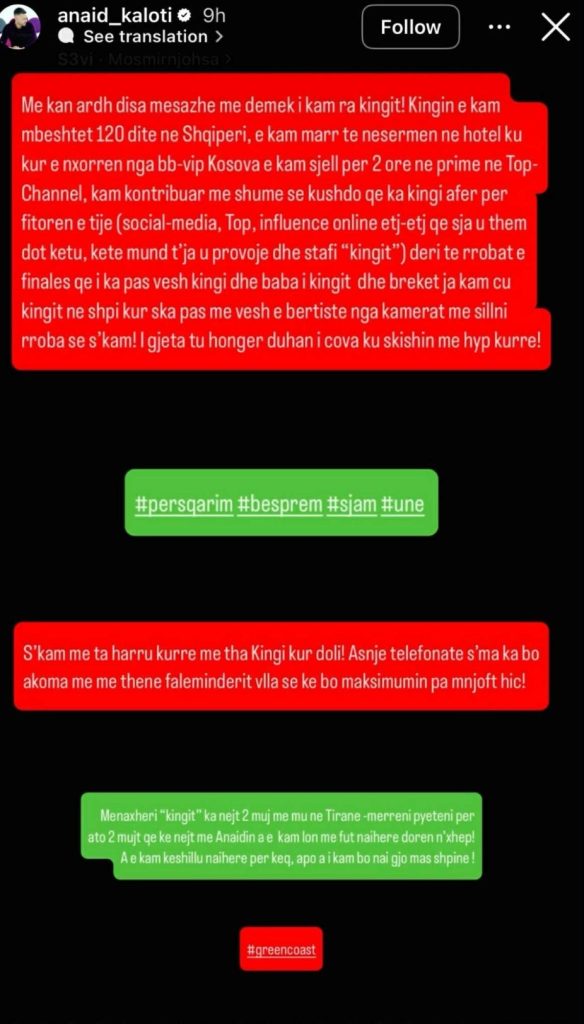 “Më kanë ardhur disa mesazhe me demek i kam rënë kingut. Kingun e kam mbështetur 120 ditë në Shqipëri, e kam marrë të nesërmen në hotel ku kur e nxorën nga BB VIP Kosova e kam sjell për dy orë në Prime në Top Channel, kam kontribuar më shumë se kushdo që ka kingu afër për fitoren e tij (social media, top, influencë online që s’jau them dot këtu, këtë mund t’jua provojë dhe stafi i kingut) deri te rrobat e finales që i ka pasur vesh kingu dhe babai i kingut dhe brekët ia kam çuar kingut në shtëpi kur s’ka pasur me vesh e bërtiste nga kamerat më sillni rroba se s’kam! I gjeta t’u ngrënë duhan i çova ku s’kishin me hyp kurrë.